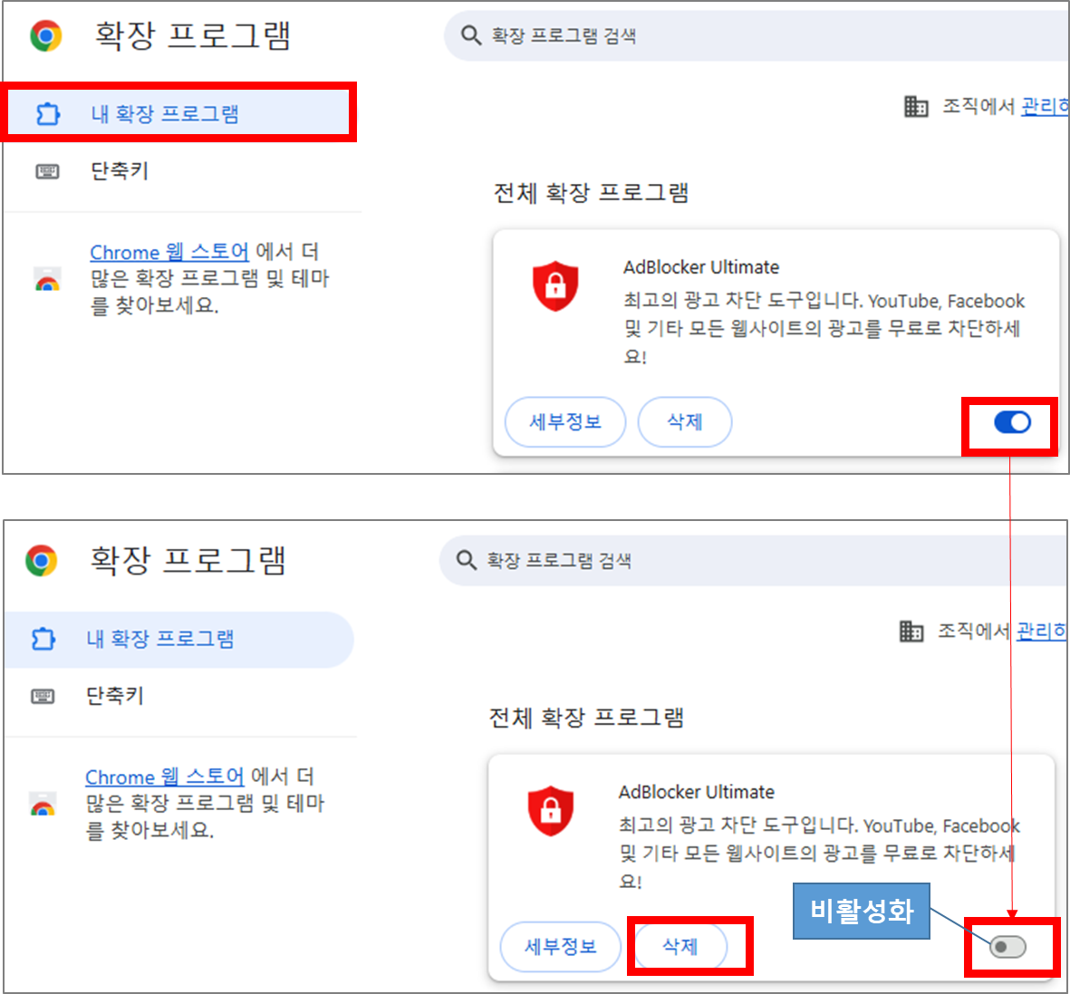 Step 2. 내 확장프로그램 > ADblock 삭제 또는 토글키 클릭해서 비활성화 (파란색 -> 회색)