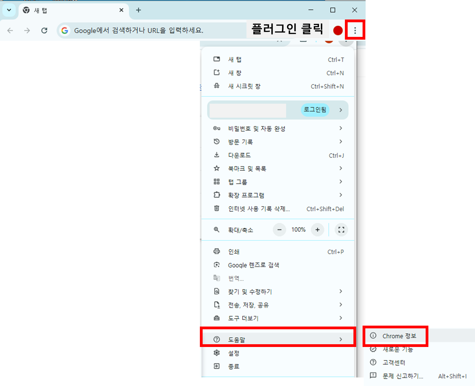 step 1. 점 3개 (더보기) > 도움말 클릭 > chrome 정보